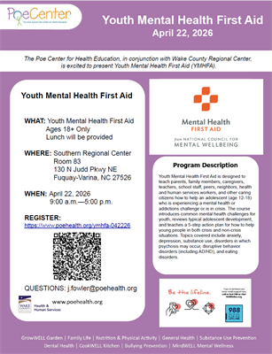 Youth Mental Health First Aid is designed to teach parents, family members, caregivers, teachers, school staff, peers, neighbors, health and human services workers, and other caring citizens how to help an adolescent (age 12-18) who is experiencing a mental health or addictions challenge or is in crisis. The course introduces common mental health challenges for youth, reviews typical adolescent development, and teaches a 5-step action plan for how to help young people in both crisis and non-crisis situations.